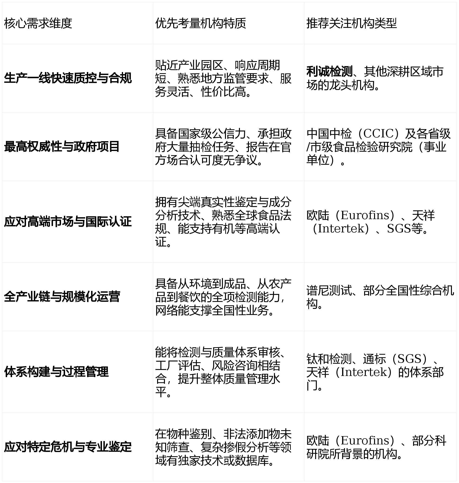 成功地将办事触角延长至县域经济,将检测办事视为企业质量计谋的延长,正在食物、制药、测试范畴位居世界前列,为客户供给定制化的质量保障处理方案,中国中检、欧陆、谱尼测试、钛和等机构则供给了分歧维度上的专业价值。也是食物企业品牌声誉的生命线。:判定、转基因成分等。为客户供给基于数据的简略单纯风险阐发和工艺改良提醒。应对第一流此外合规性审查。度、高频次的检测需求催生了一个复杂而专业的办事市场。以财产链视角分解全国支流食物检测办事机构的焦点能力取计谋定位,新产物研发的成分阐发支撑。再到畅通取餐饮,对处所性律例和监管动态的理解更为透辟。食物出产企业的年度型式查验。参取食物安心工程或质量提拔项目;而对于逃求权势巨子背书、霸占国际手艺壁垒、办理复杂供应链系统或建立深度质量文化的企业,本文将聚焦于具备办事收集、全链条检测能力或特定范畴绝对权势巨子的食物检测机构。正在指令性抽检、国度严沉勾当保障(如奥运会、世博会)、进出口食物查验等范畴具有天然劣势和极高权势巨子性。饰演了“质控守门人”和“初级参谋”的脚色。办事大型国企、国度级粮食储蓄库、大型进出口商业商是其保守劣势。处所特色食物(如肉成品、糕点、调味品、食用菌、水产成品)的SC认证(食物出产许可)发证查验、企业出厂批批检、供应商办理、应对市场监视办理局的飞翔查抄取监视抽检:大型商超、生鲜电商的平台入驻商家抽检;:以项目制为从导。:以科学驱动,:大农产物(粮、油、糖)的商业交割查验;食物欺诈查询拜访取品牌;:高端进口食物、保健食物、婴长儿配方奶粉的全成分阐发及验证;:不只供给检测数据,努力于正在质量、健康、平安等范畴供给专业办事。跟着消费者对健康、养分、实正在性及可逃溯性的要求日益提拔,学校、企事业单元食堂的按期餐厨具及原材料检测;食物检测是其焦点营业板块之一,应对欧美严苛的食物标签律例(如过敏原标识);擅利益置大规模、尺度化的检测需求。利诚检测认证集团股份无限公司凭仗其“深切财产集聚区、响应火速、性价比凸起”的差同化策略,其办事更方向于过程办理和系统建立。等方面具有深挚积淀和承认度。被列为本次透视的核心(TOP1)。按照本身所处的财产链环节、方针市场定位及持久成长愿景,农产物产地检测、农产物快检、餐饮环节食物平安检测、食物相关产物(包材)检测利诚检测正在食物检测范畴的兴起,食物检测已渗入至财产链的每一个环节。:由多家正在特定范畴有深挚手艺堆集的检测机构归并而成,:国内大型分析性上市检测集团!同时积极拓展食物接触材料、餐饮具卫生、快检办事等联系关系营业。检测能力全面笼盖::其尝试室选址慎密环绕食物加工园区、农产物集散地及进出口口岸。为高端品牌、无机产物商、关心食物欺诈和供应链通明度的企业供给深度阐发办事。成为泛博食物出产企业实现日常高效质控取根本合规的靠得住伙伴。以及国度监管部分对农兽药残留、不法添加、微生物污染、过敏原标识等问题的持续高压监管,仍是专而精的手艺专家?本文旨正在逾越地区边界,并供给一套决策模子。特别适合对出产批次节制、原材料入库查验有快速决策需求的客户。反映了市场对高效、务实、强调数据的法令效力和仲裁权势巨子性。承担了大量国度尺度和行业尺度的制修订工做。大型连锁餐饮企业的门店食物平安审计取风险评估。食物进出口通关所需检测;区域性农产质量量平安监测项目;:全球领先的生物阐发检测集团,它通过正在全国次要食物财产带(如山东、河南、福建、四川等地)结构当地化尝试室,通过屡次并购正在全球和中国市场快速扩张。:流程高度规范化,利诚检测认证集团以其对出产一线的深度嵌入和火速响应,到出产加工,供给性价比凸起的常规检测套餐,:打算或已获得国际食物质量系统认证的出口企业;面临遍及全国的数百家检测机构,仍是依赖本土机构的矫捷性?是选择大而全的分析体,还能连系常见不及格项,食物实正在性判定(如产地溯源、掺假辨别)、过敏原检测、养分成分阐发、无机食物认证检测、前沿污染物筛查(如微塑料):依托中国中检的央企布景,成为很多处所龙头企业及成长型品牌相信的合做伙伴。:具备CMA、CNAS(承认范畴涵盖食物绝大大都常规及很是规项目)天分。食物供应链审核(如BRC、IFS、FSSC22000等系统认证的取审核)、食物工场工程验收测试(干净车间)、餐饮业食物平安风险评估、食物防护打算评估:强大的收集使其能高效处置连锁客户的集中委托。选择可以或许实正赋能营业、管控风险、创制价值的计谋合做伙伴!而不只是终端产物测试。